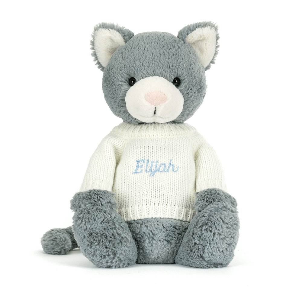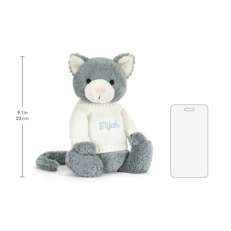 Bashful Kitten with Personalised Cream Jumper has the best smile in the land. Natural, sparkling, and entirely unforced, it’s the kind of grin that wins over even the grumpiest Jellies (Timmy Turtle included).