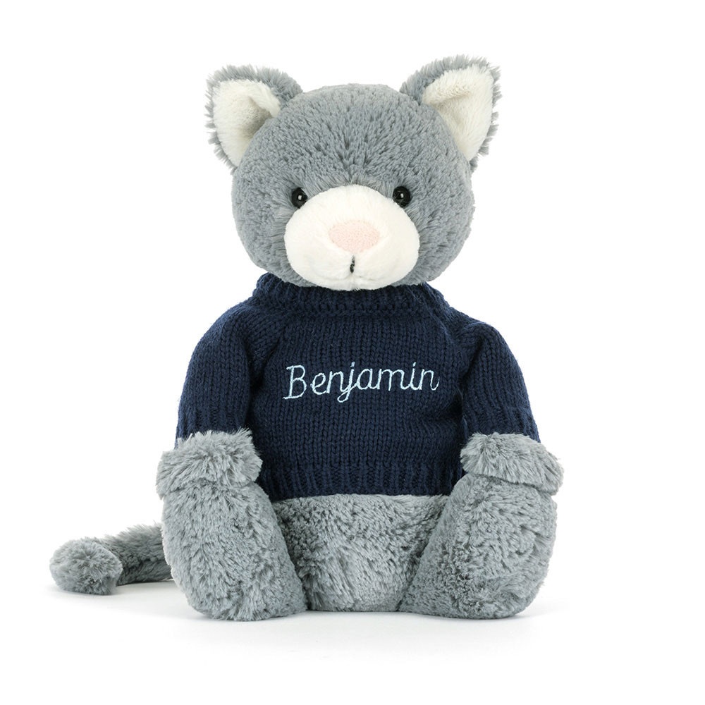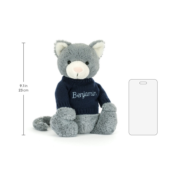 Bashful Kitten with Personalised Navy Jumper has the best smile in the land. Natural, sparkling, and entirely unforced, it’s the kind of grin that wins over even the grumpiest Jellies (Timmy Turtle included).