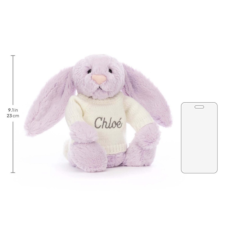 Bashful Lilac Bunny is a super soft beloved Jellycats and can now be made extra special with a personalised cream jumper! With a choice of fonts and thread colours, your bunny can truly be one of a kind!