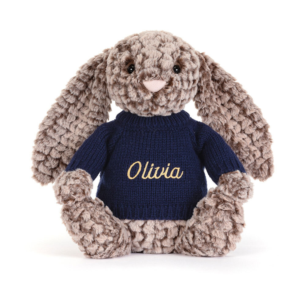 Bashful Luxe Bunny Pine is a luxuriously soft beloved Jellycats and can now be made extra special with a personalised navy jumper! With a choice of fonts and thread colours, your bunny can truly be one of a kind!