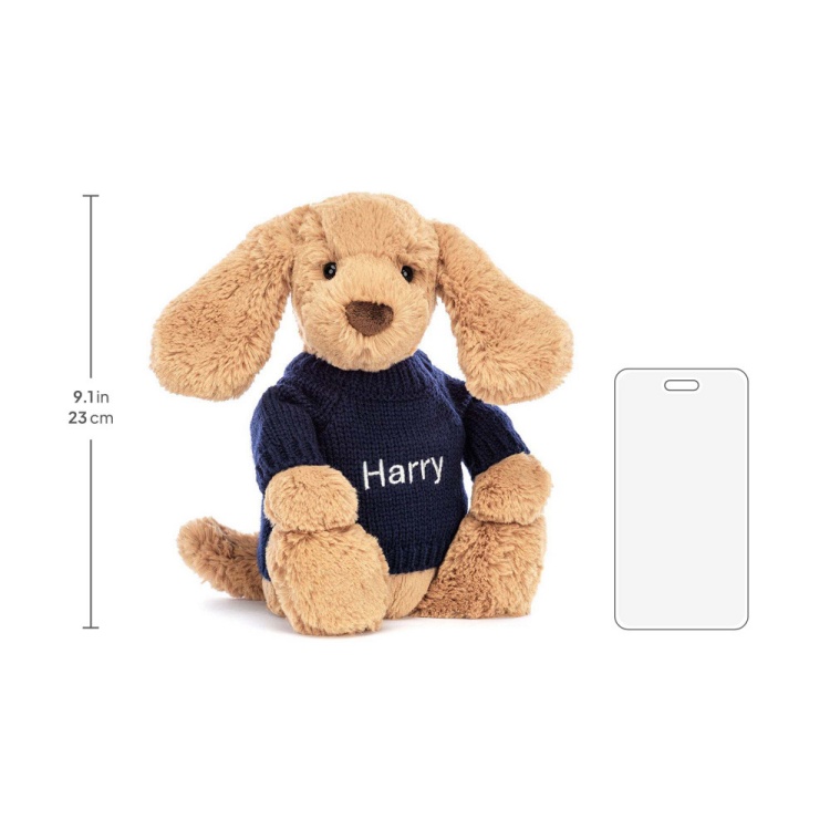 Bashful Toffee Puppy is a super soft beloved Jellycats and can now be made extra special with a personalised navy jumper! With a choice of fonts and thread colours, your puppy can truly be one of a kind!