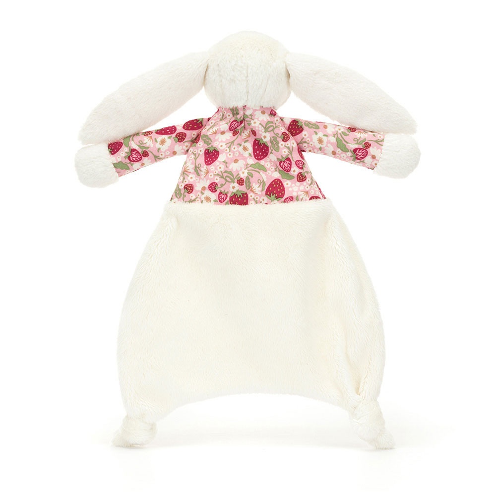 Irresistibly soft in a cream coloured fur made from recycled fibres, with strawberry patterned ears in an original Jellycats design, Blossom Cream Bunny ‘Berry’ Comforter features our beloved Bashful Bunny signature long lop ears, a pink suedette nose and embroidered eyes. Designed with an un-stuffed body yet delicately squashy paws and bobble feet, making it easy for little hands to grab hold of and comfort themselves.
