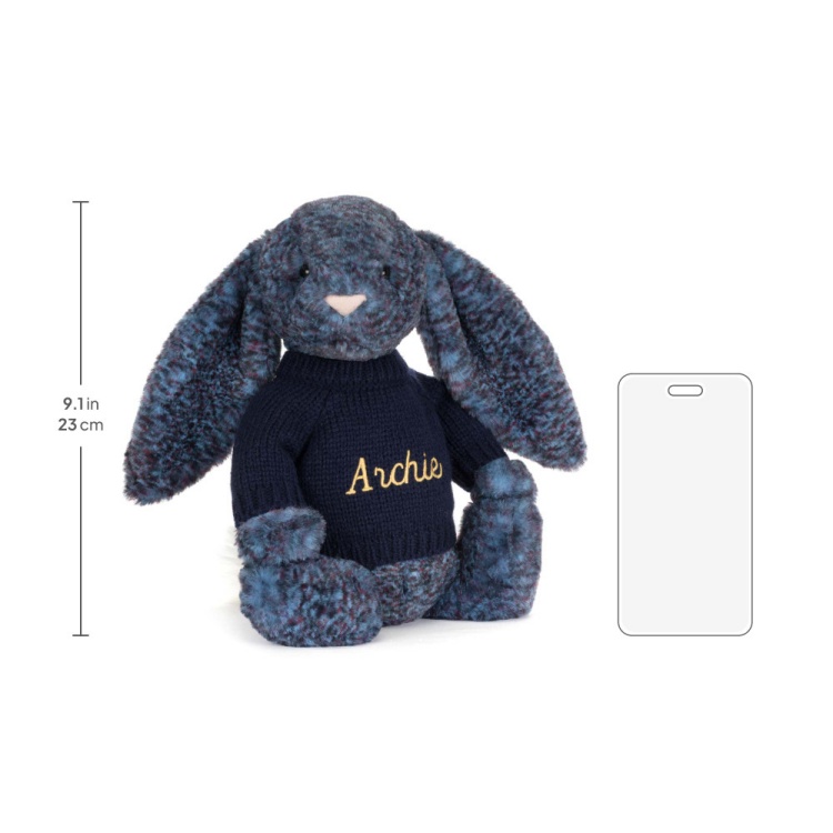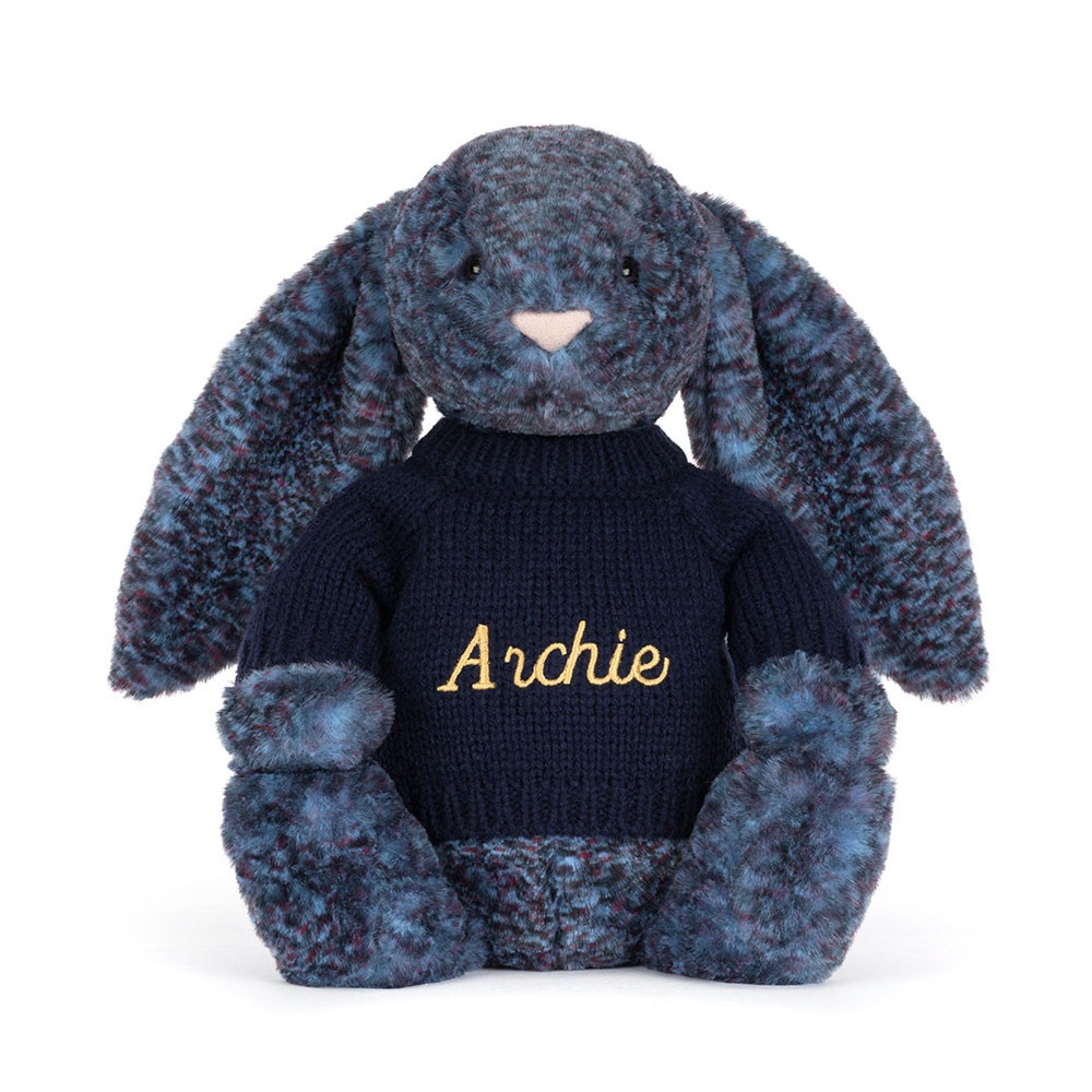 Hopscone Luxe Bunny is a super soft beloved Jellycats and can now be made extra special with a personalised navy jumper! With a choice of fonts and thread colours, your bunny can truly be one of a kind!