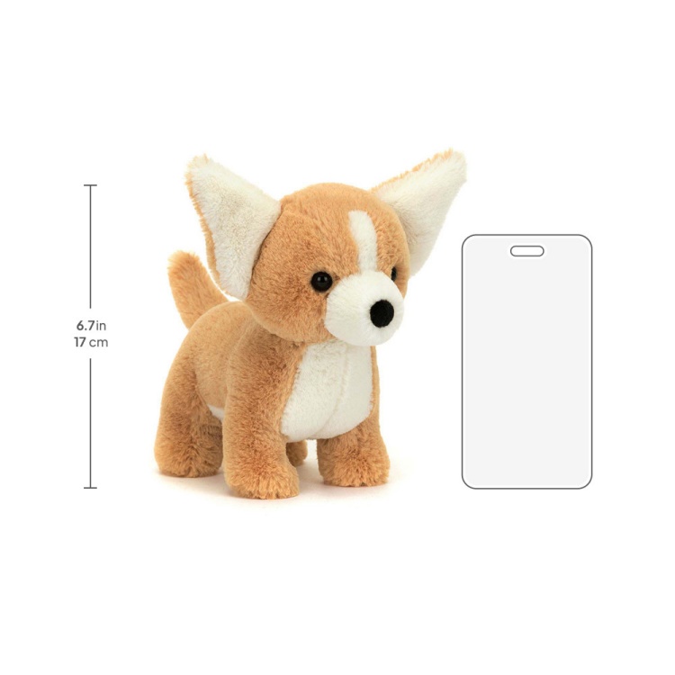Isobel Chihuahua may have tiny legs, but this feisty pup can always keep up! Dreamily soft in honey fur, with bold vanilla patches, flared two-tone ears and a suedette nose, bright-eyed Isobel is ready to roam! A snuggly pal for long car journeys.