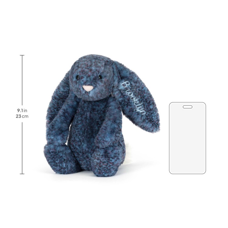 Hopscone Luxe Bunny is the sweetest little bobtail in our most luxurious mottled blue-black fur, with a pink nose and long ears you can embroider with a special message. With a choice of fonts and thread colours, you can share joy with a truly unique Hopscone Luxe Bunny.